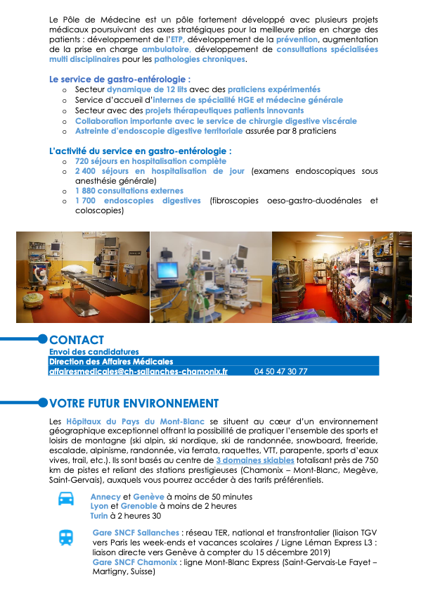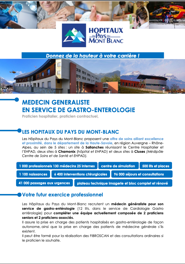 Non classé Médecin généraliste en service de gastro-entérologie (Hôpitaux du Pays du Mont-Blanc) par Webmaster temporaire|Publié 8 décembre 2023 Les internes avec license de remplacement sont les bienvenus aussi.