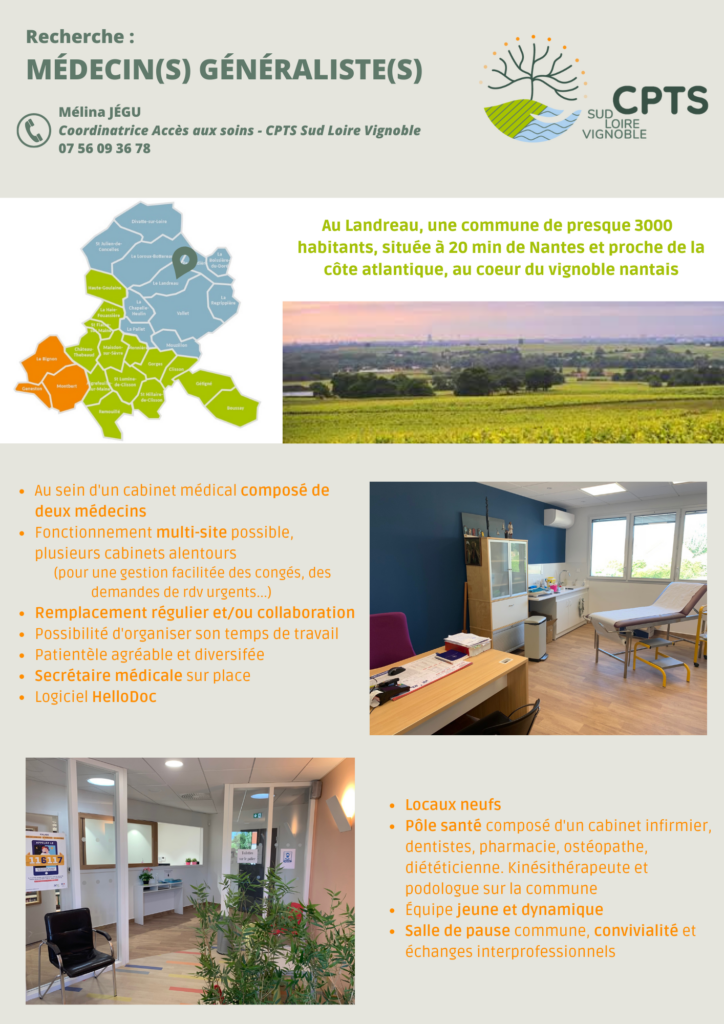 Publié 8 décembre 2023 Centre de santé St Viaud (44) L’association Soinsanté basée à Saint-Père-en-Retz recrute 2 médecins, 3 jours par semaine minimum pour l’ouverture de son nouveau centre de santé à […]