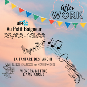 Le SIMGO vous propose un AFTERWORK le mardi 28/03/2023 au Petit Baigneur ! RDV à partir de 16h30 après votre journée de choix. Il y aura aussi sur place la fanfare des archi, les durs à cuivre, pour mettre l'ambiance ! Nous espérons vous voir nombreux !